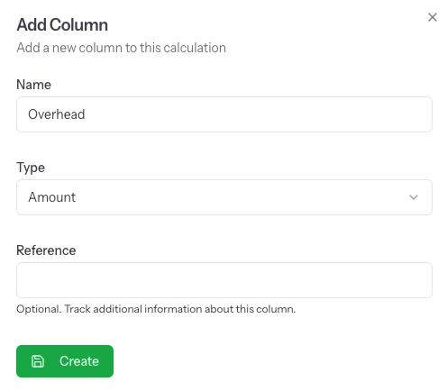 Reference - Add a reference. This field is not used by the calculation but provides a way to track additional information about this column. An example of using the reference field is if you are adding a general ledger account and using the account name as the column name, you may also want to track the account number. In this example, the account number can be added to the Reference field. This field is optional.